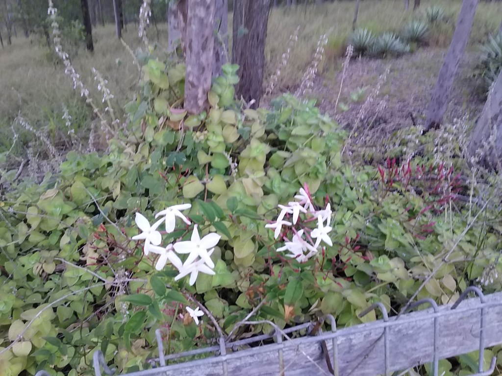 Tarsha was a dearly loved cat who blessed our lives for 20 years.  She was buried on a bank beneath a tree.  I planted a small vine but knew the encroaching bush would probably overwhelm it.   One morning after rain, I took the above picture. It was a moment of pure joy because the small flowers had struggled against severe odds to burst out as a tribute to Tarsha.