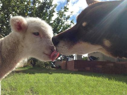 A moment when the Kelpie dog bred to be a guardian of the flock extends loving nurture to one of the weakest in the flock.